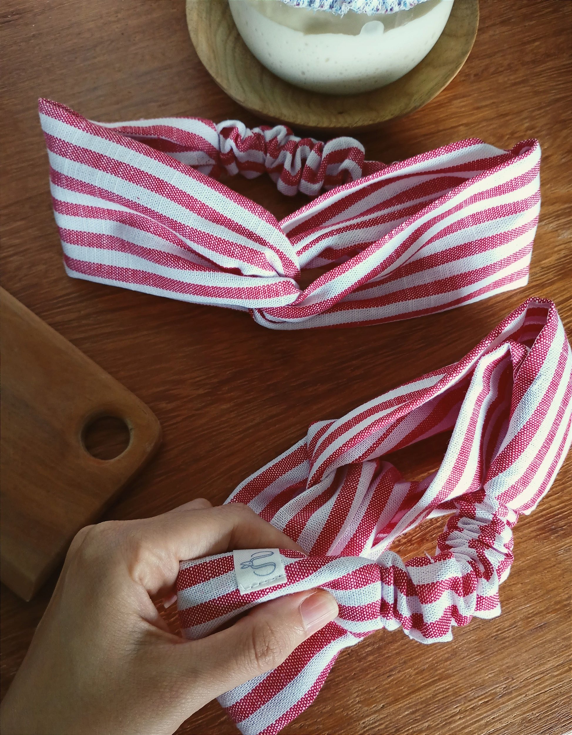 Possui elástico embutido na parte de trás, garantindo ajuste confortável e seguro, além de um delicado nó frontal..