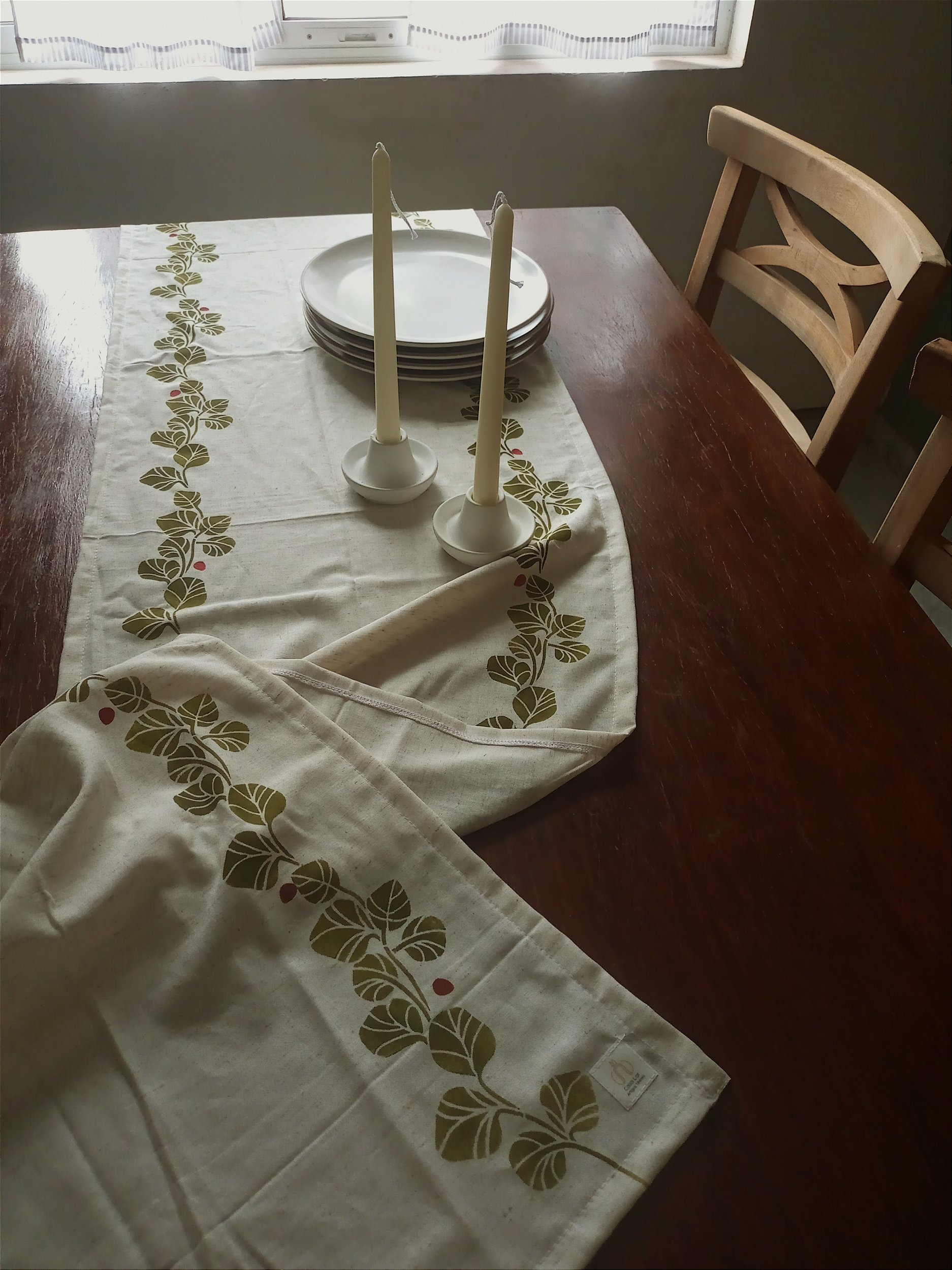 Os caminhos de mesa da Casa Lar, são delicadamente pintados a mão, com padrões exclusivos e desenvolvidos em um gentil trabalho artesanal: o block printing.